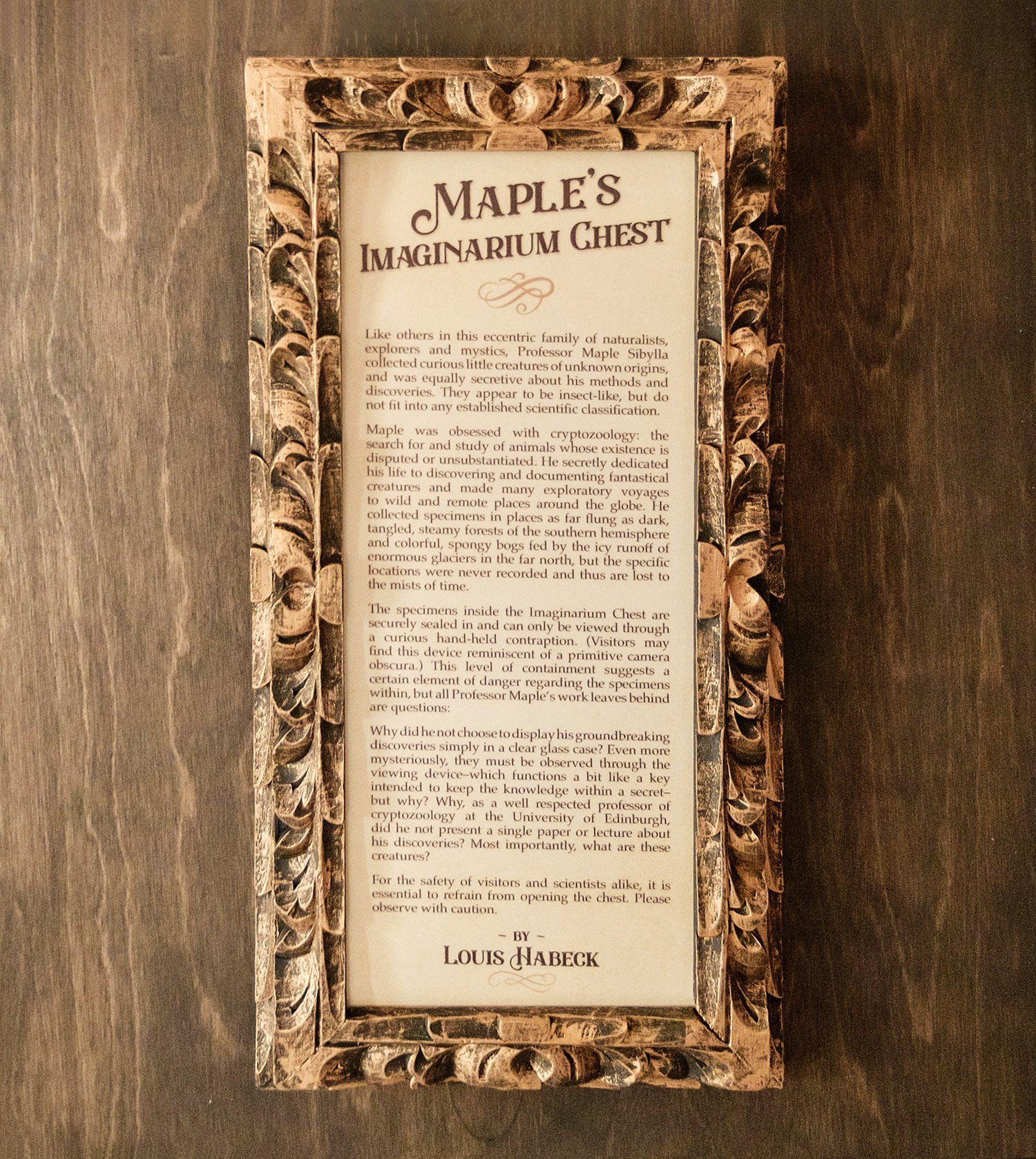 The specimens inside the Imaginarium Chest are securely sealed in and can only be viewed through a curious hand-held contraption. (Visitors may find this device reminiscent of a primitive camera obscura.) This level of containment suggests a certain element of danger regarding the specimens within, but all Professor Maple’s work leaves behind are questions: