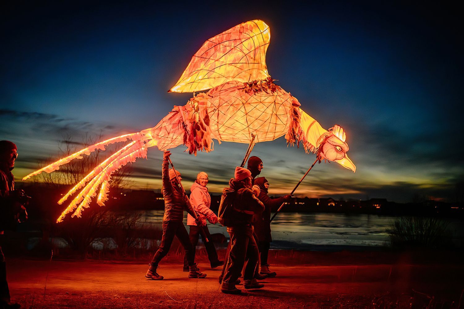 Phineas - Phinny to his friends - is the majestic protector of the land of make believe. He uses his keen eyes, sharp beak, and fierce flappers to light up the dark corners and tear through the grey clouds left by gloomy joy-gobblers everywhere. Phinny was born in fire long, long ago in a volcano of raspberry lava, orange pop rocks, and lemony flames. He has celebrated 789 re-birthdays! Did you know that when he first emerged from the volcano, Phinny was smaller than a spring chicken? On the eve of every lantern parade, he burns to a pile of ash and emerges in fresh and fiery plumage just a little bit larger. Who knows how big he’ll grow?