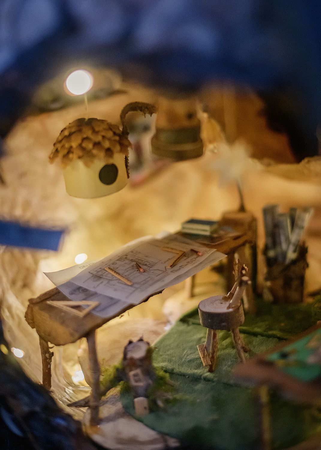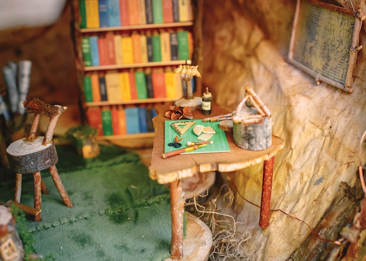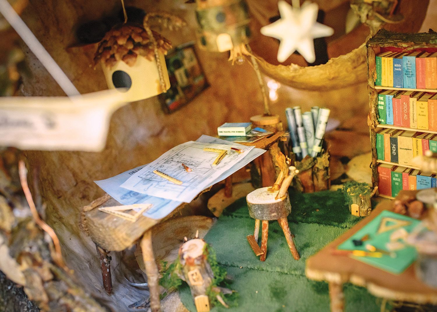 Amy lives in Bozeman with two humans–one small and one big,–a giant dog named Rooster, and two bossy cats. She can often be found having Men at Work dance parties with her little one or designing a board game about dogs. Amy first worked with RAS when she created a Cabinet of Curiosities. That project and this one fed her love for making miniature things, and she loved making miniature, miniature model homes this time! This fairy architect’s studio also contains a callback to Amy’s cabinet of curiosities, which serious fans might spot! For more information about Amy and her work, visit her website.