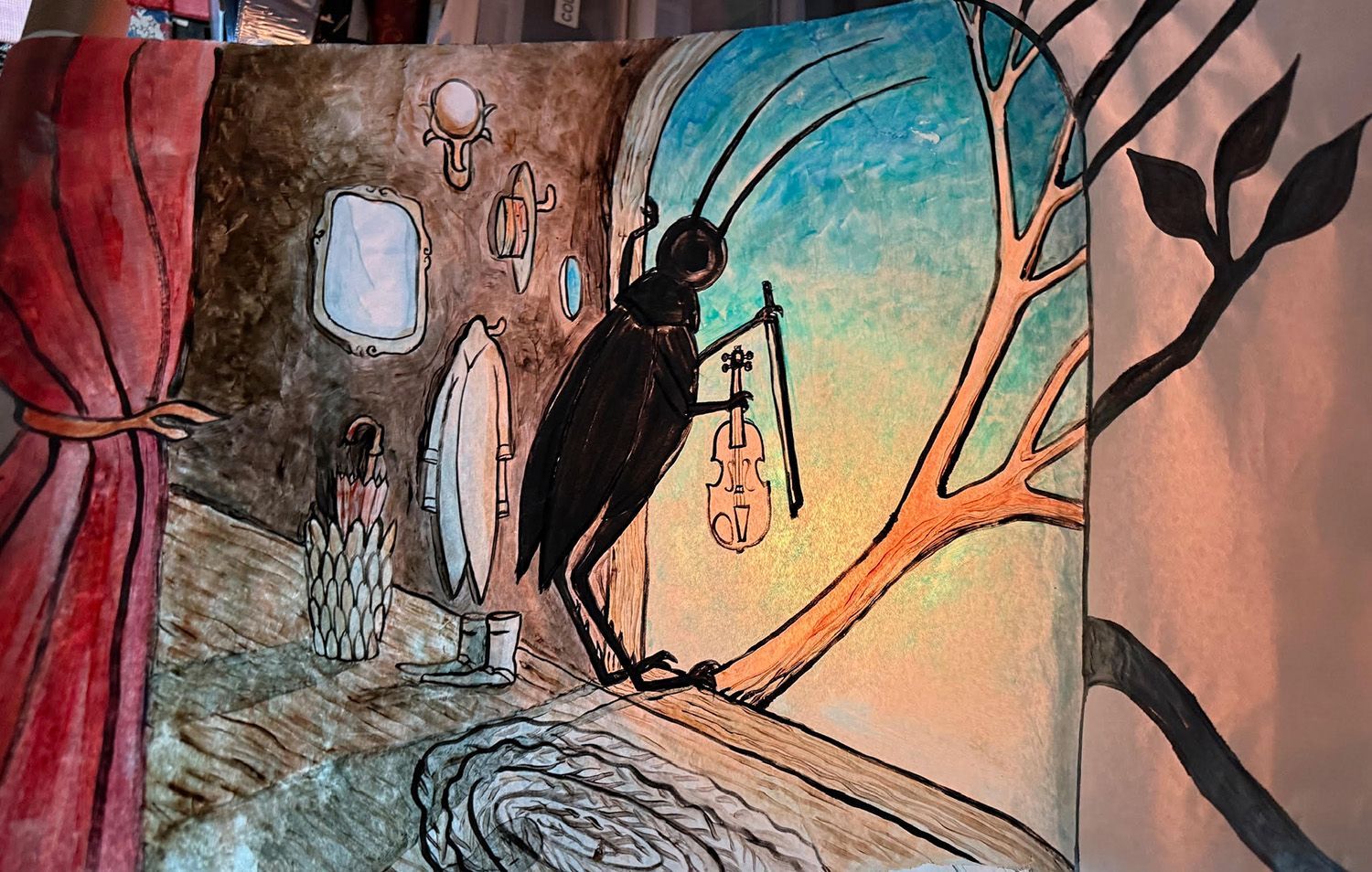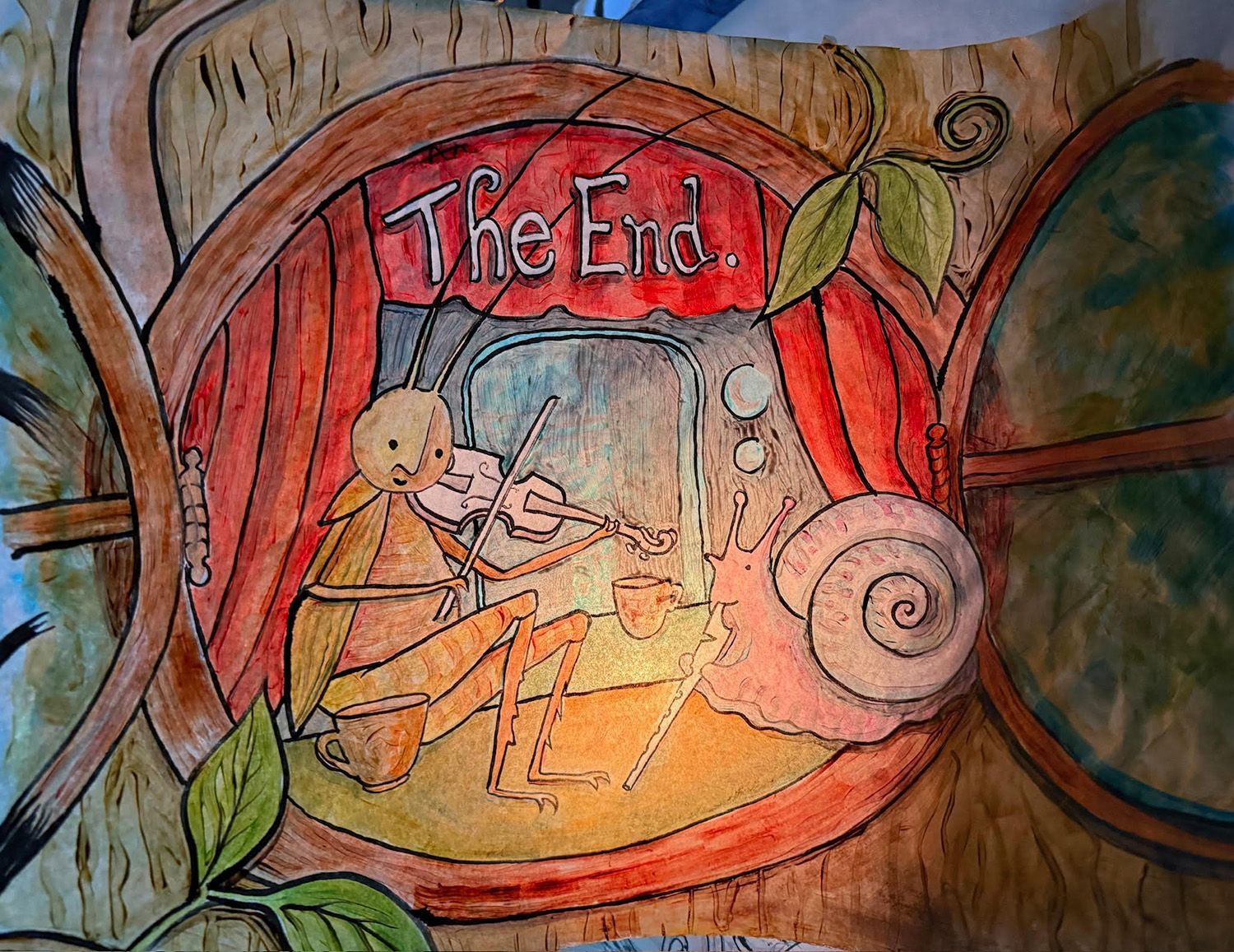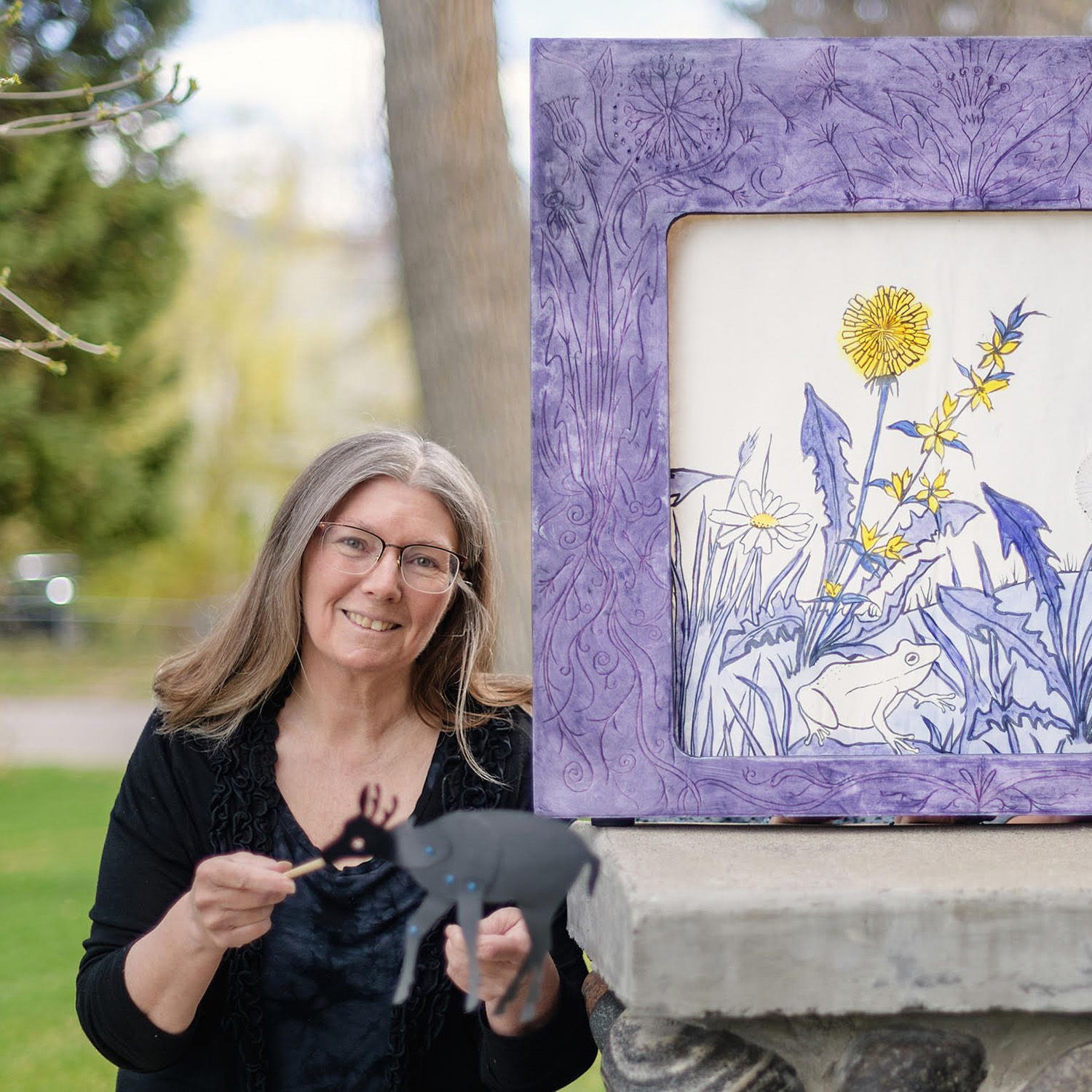 This crankie was created in collaboration between storytellers Danielle and Sarah at Random Acts of Silliness and artist Marla. Marla created the crankie scroll using acrylic ink and thinned acrylic paint to preserve the luminous colors of Japanese calligraphy paper glued to a frosted plastic substrate.