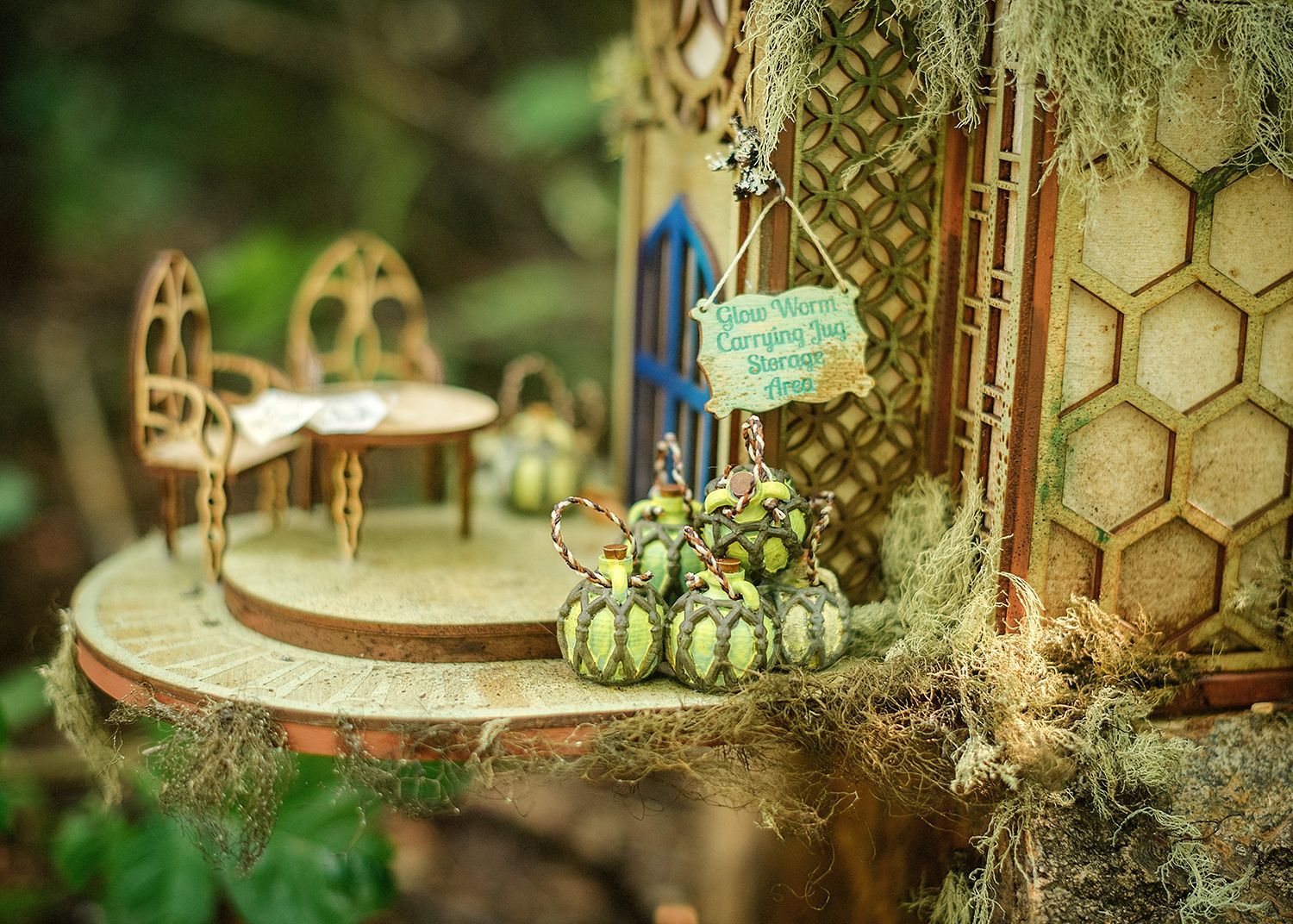 Many have asked how the village of Bumblewood twinkles so brightly at night. At last, we have the answer! Glow Worm Gardens is a nursery for the village’s hardest-working light sources: glow worms. Glow worm husbandry is a delicate and energy intensive art, and the little wigglers must be carefully tended by members of the Glow Worm Keepers Guild (GWKG). Here at the nursery, eggs are incubated and hatched, then the tiny grubs are transferred to clematis blossoms where they mature to maximum wattage before being placed around the village.