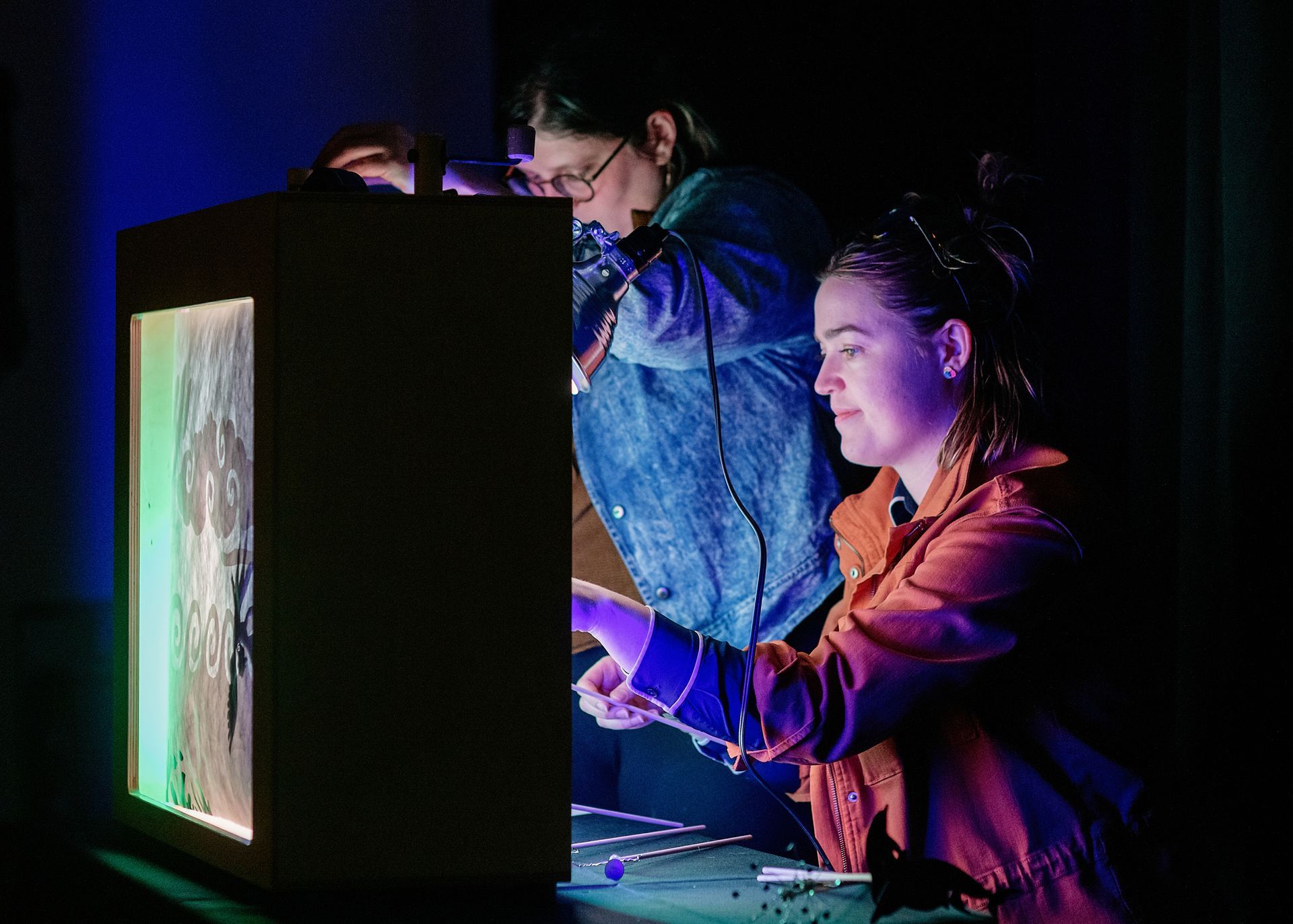 This story feels so timeless you’d believe its been passed down through the ages, but it was created just for Crankie Fest. It is a nature folktale, a mythical creature legend, and a love story all rolled into one. It was made using vinyl, ink and changing color lights.