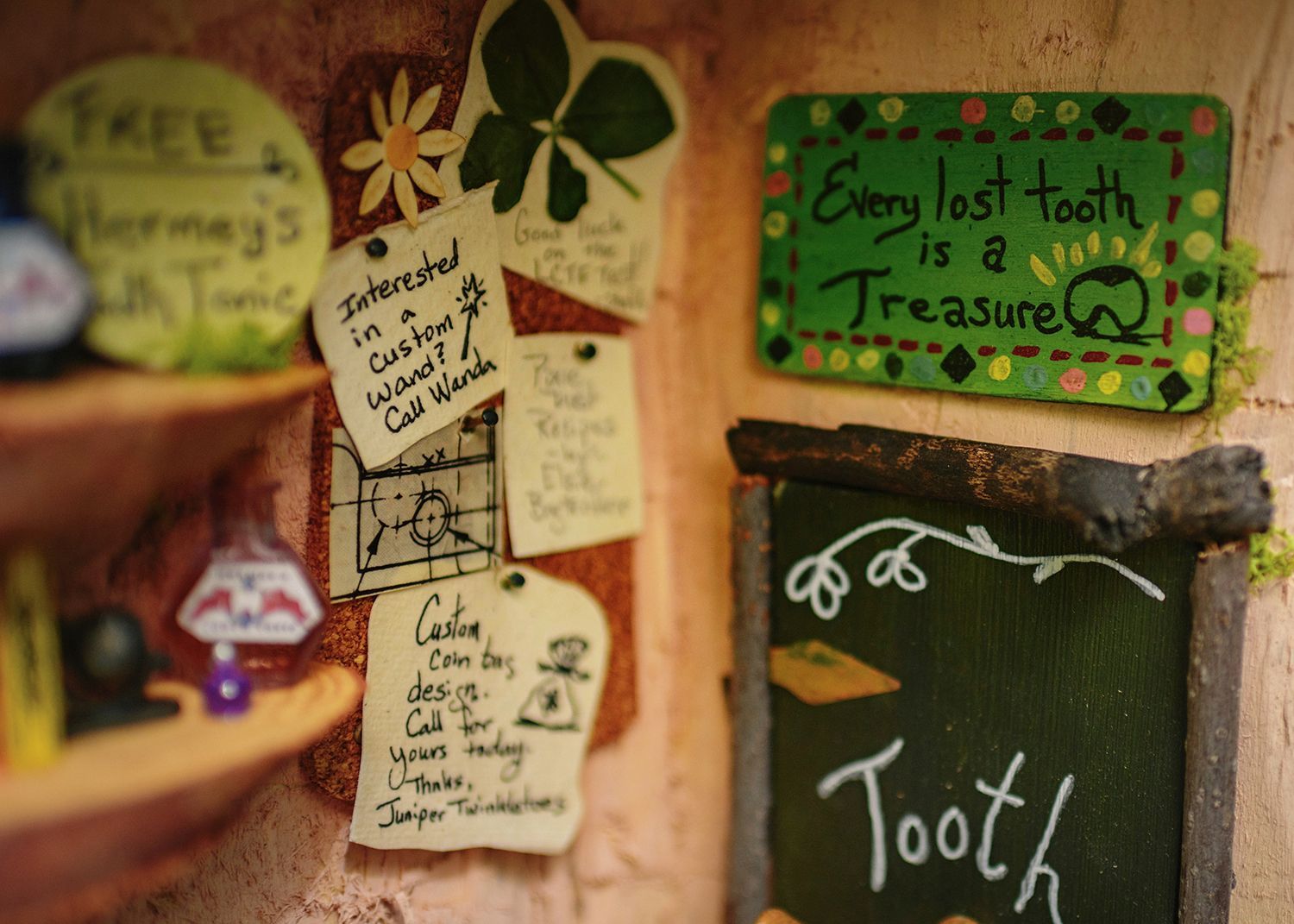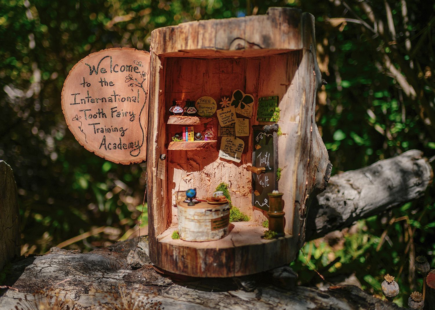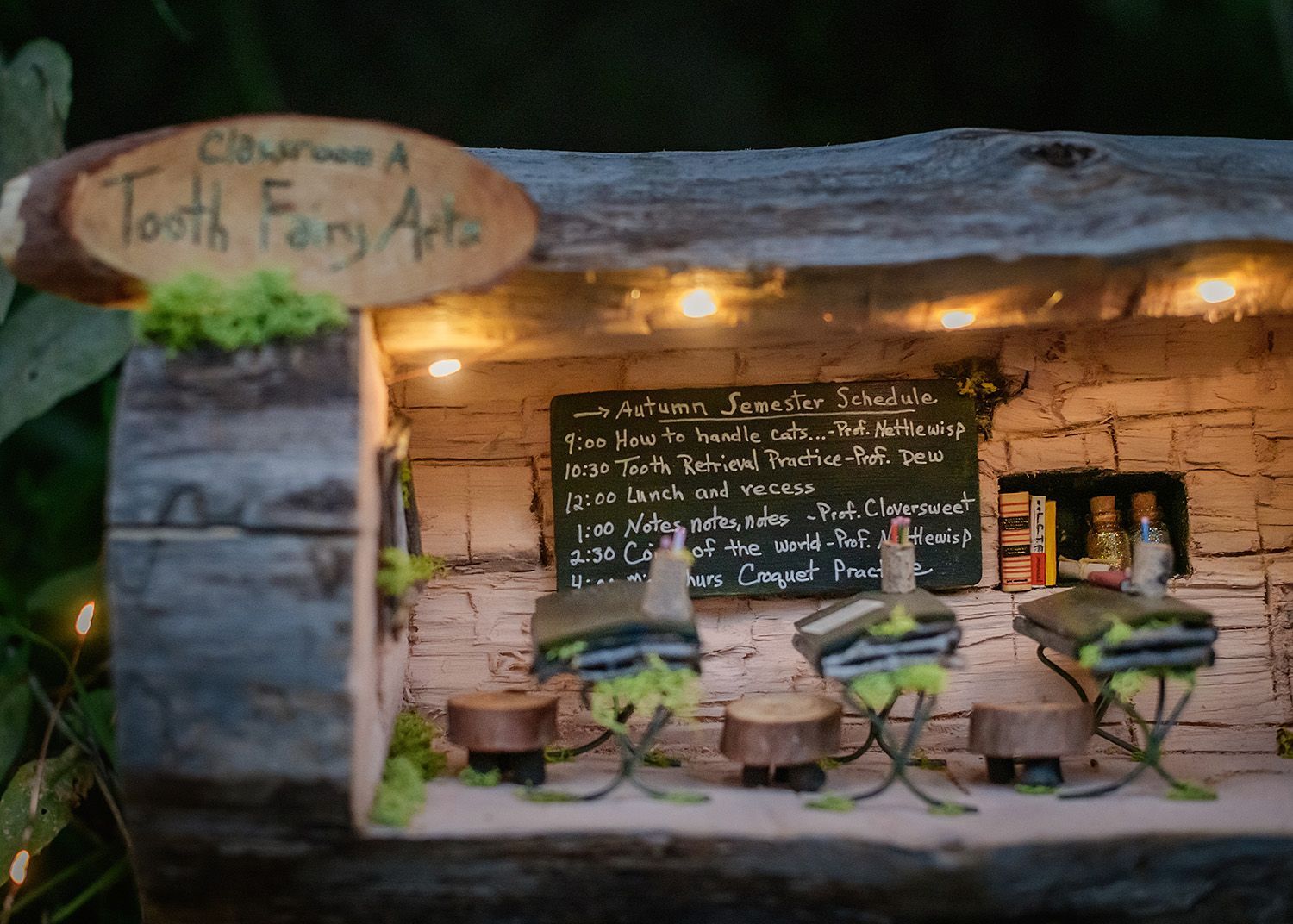 Hold onto your pearly whites! Bumblewood Thicket is proud to be home of the world-renowned International Tooth Fairy Training Academy. Aspiring tooth fairies fly in from all over the globe to study the complex arts of tooth retrieval, transportation, and storage in pursuit of their LCTF–Licensed Clinical Tooth Fairy–degrees. Professors Cloversweet and Nettlewisp offer apprenticeships to young local fairies as an early opportunity to sink their teeth into the training program. Since cavities are the nemesis of every tooth fairy, the practical professors distribute a free tooth tonic to all members of the community so they may indulge their sweet tooths without fear.