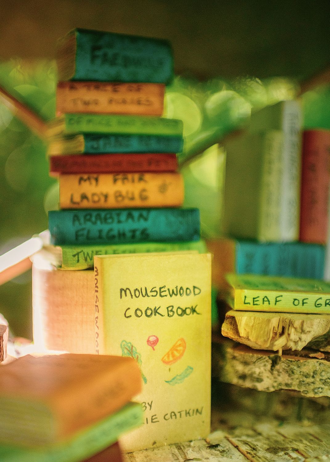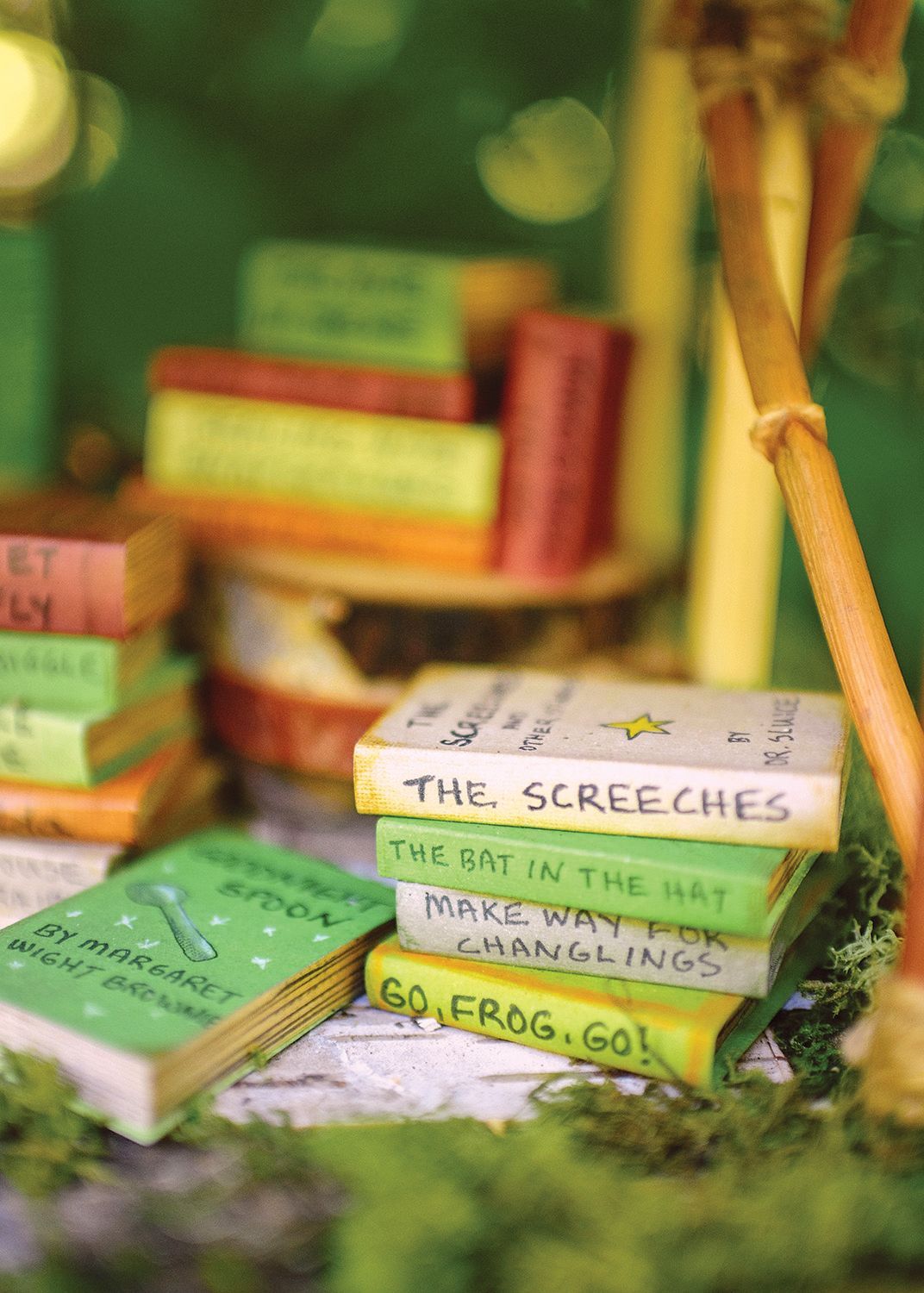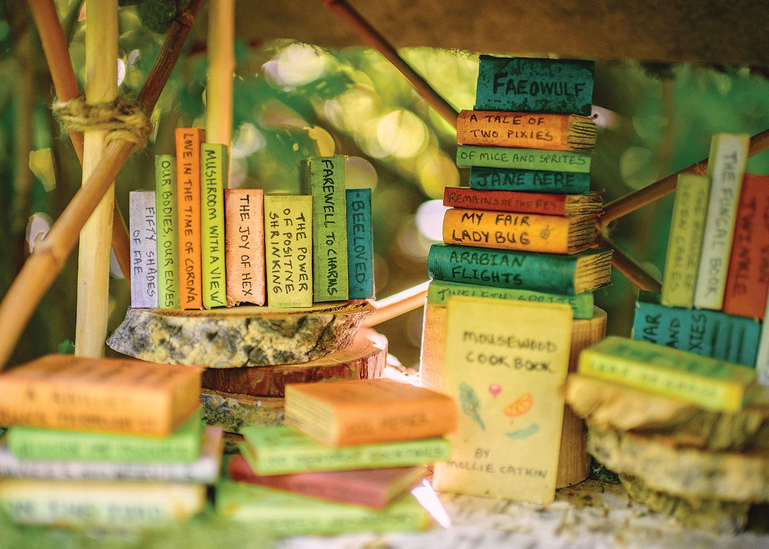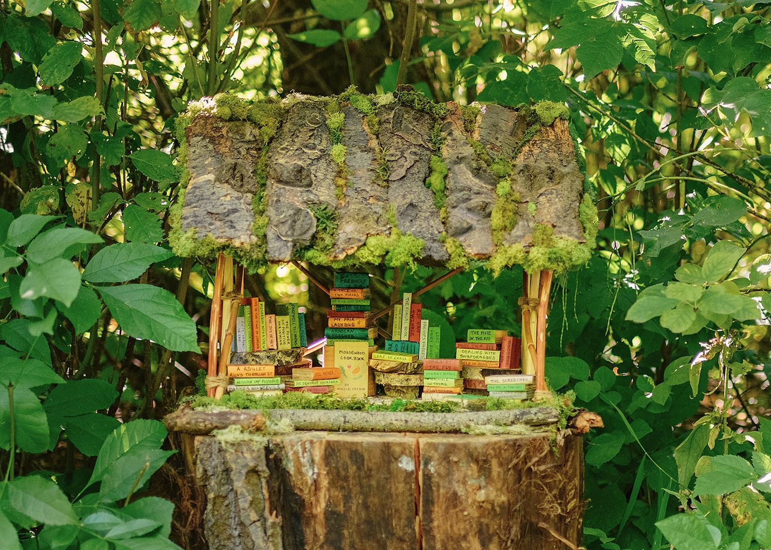 Welcome to the Little Fae Library, where anyone can take a book or leave one! You may recognize this nomadic library from Flutterby Thicket, a nearby fairy village first discovered by humans just a few years ago. The library moves where it is needed, and it has happily roosted here in the village all summer. Pardon the mess! The library is in a bit of a shambles due to a recent bookworm infestation. Thankfully the bookworms have been gently relocated to a paper birch tree across town, where they can munch away to their hearts’ content.