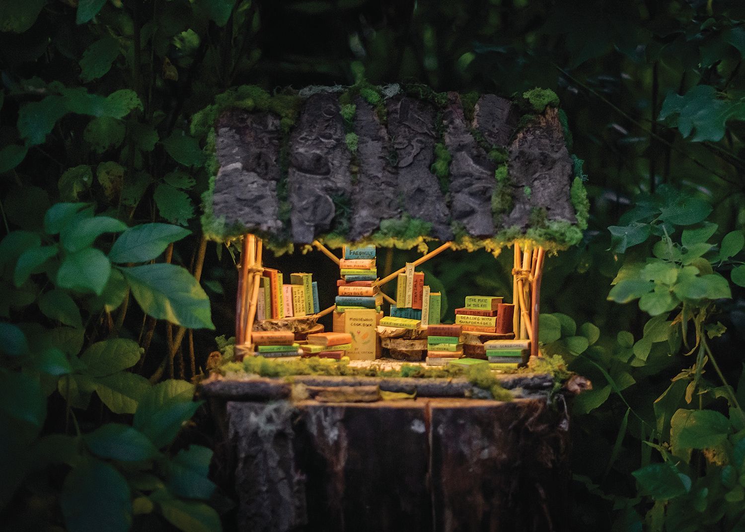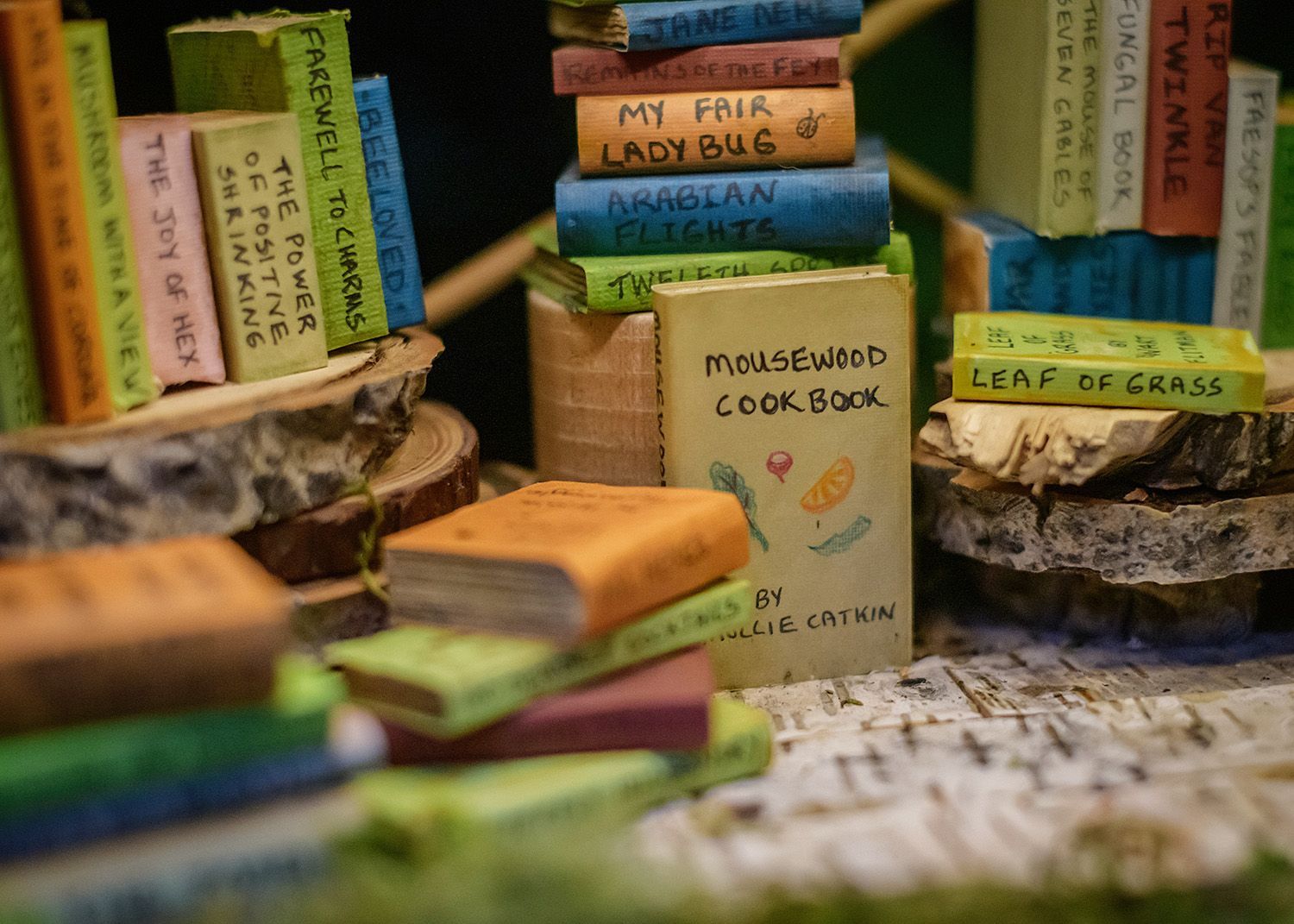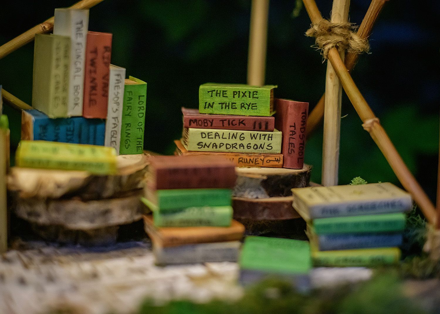 The Little Fae Library was originally installed in Flutterby Thicket, RAS’ first fairy village in 2020. Anna would like to thank her verbally gifted sweetie, family, and friends for contributing many of the book titles seen in the library. Thanks as well to Molly Stratton for creating the original structure for the library. You can find Anna, her creatures, and her garden on