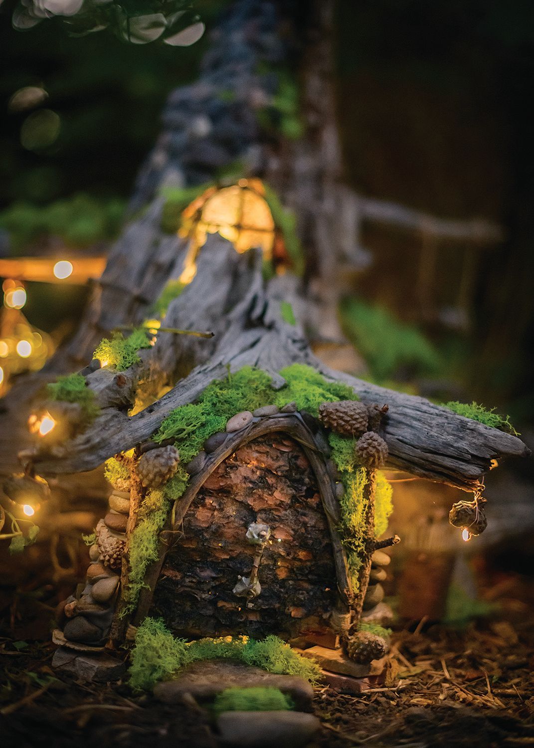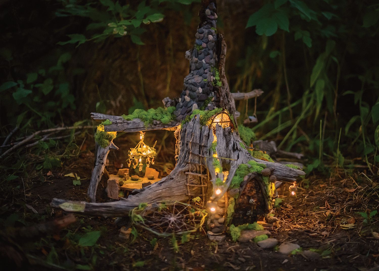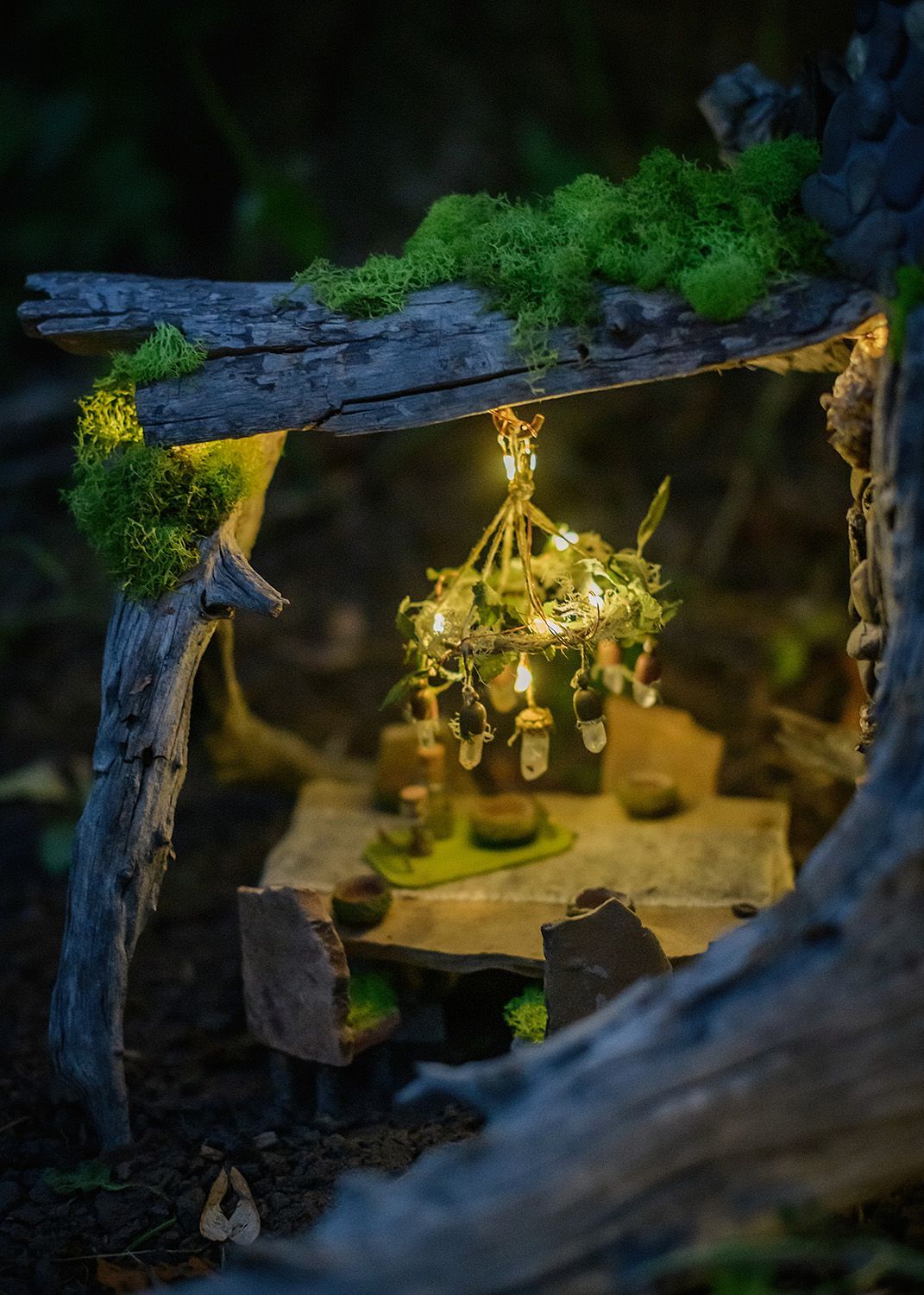 As you may have guessed from their name, the Mason family are all skilled stoneworkers. Shale and Ruby, with the help of young Flint and Mica, crafted the river pebble chimney and walls of their cozy home. Shale’s superb craftsfaeship can be admired in many other stone structures throughout the village. When not stacking stones, the family enjoys fishing for minnows in the nearby river. Ruby loves entertaining guests over cups of thimbleberry wine in the outdoor kitchen, where the chandelier sparkles late into the evening. The boys love reading and are constantly flying off for new books from the Little Fae Library next door.
