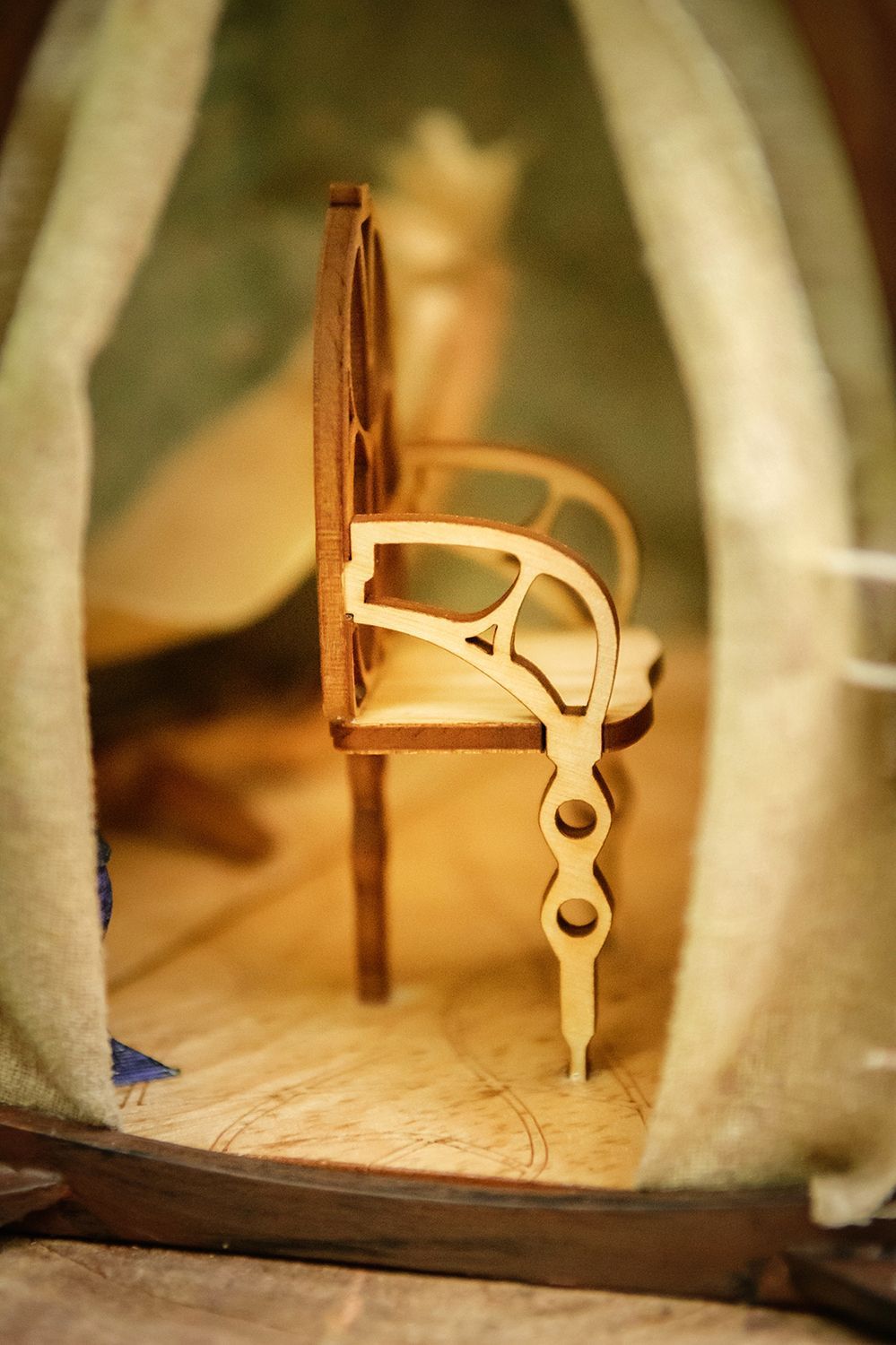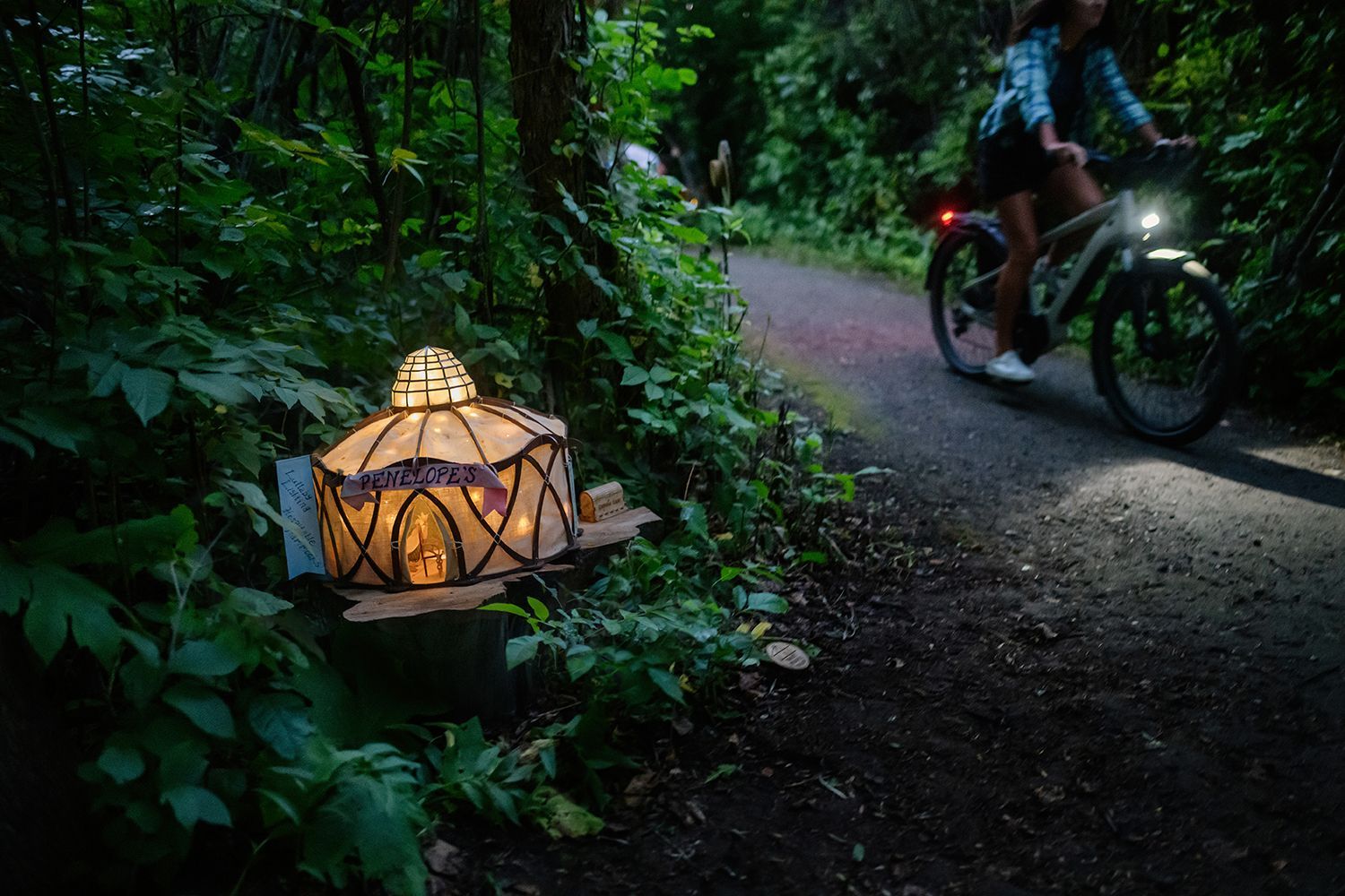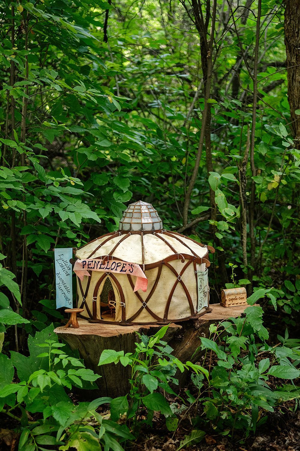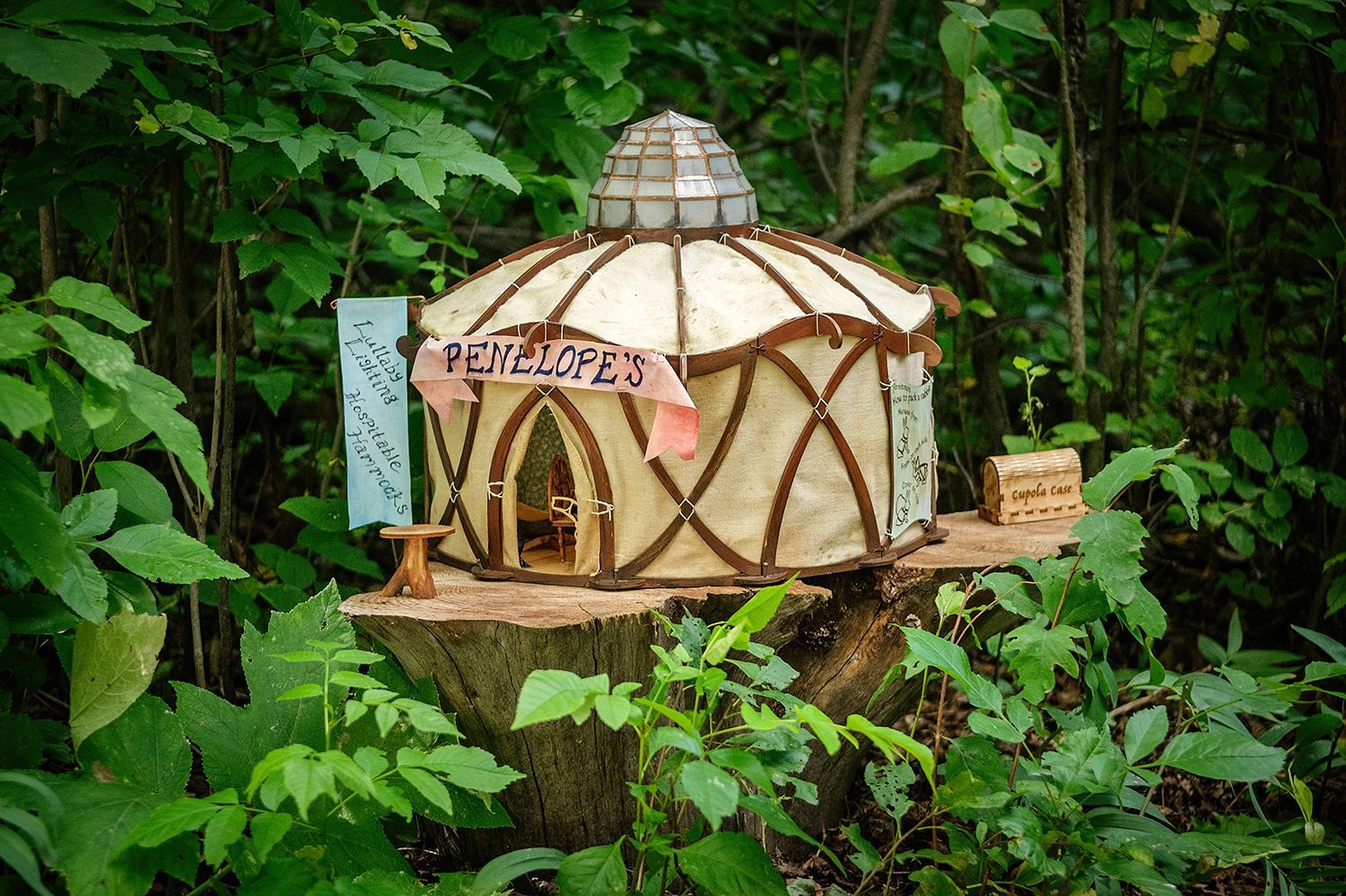 Penelope’s Peripatetic Pavilion is a traveling hotel for fairies in need of temporary housing, a common occurrence in Bumblewood. Since most fairy homes are extremely cozy, they have no spare room for guests, and if a fairy’s home is damaged by weather or critters, they have to move out while they renovate. In fact, Shae and Lanette Fitzwiggle recently stayed at the pavilion while finishing work on their tiny home. When traveling to a new location, proprietor Penelope engages the services of a team of pack rabbits. They carefully hop the whole operation–including the multi-faceted terrarium skylight where Penelope grows her special greens–to the next location.
