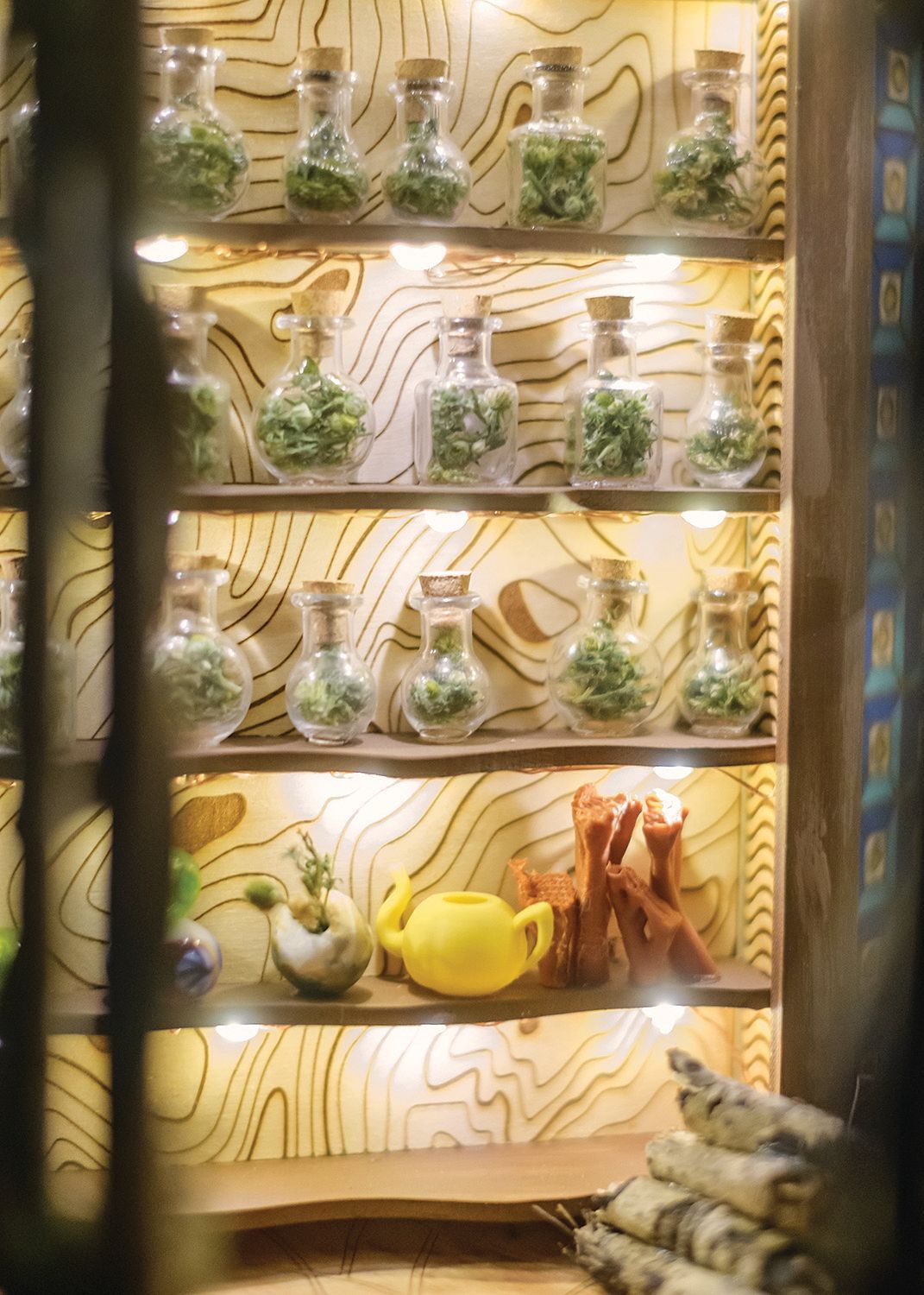 This cluster of gourd-shaped pods is home to the Schnarchenwald (pronounced Shnark-en-vald) family, who are afflicted with a very rare condition. Every member of the family–from the youngest child to the eldest grandparent–snores thunderously. To cope with the cacophony and ensure a good night’s sleep, their bedrooms are cozy sound-proofed chambers designed for just one fairy occupant each. To aid with their sleep challenges, the family gathers pineapple weed, also known as wild chamomile, to create a variety of snooze-inducing tinctures and teas. The multi-generational members of the Schnarchenwald family love to sit on their balconies in the evening, sipping tea and singing together before retiring to their individual sleeping pods.