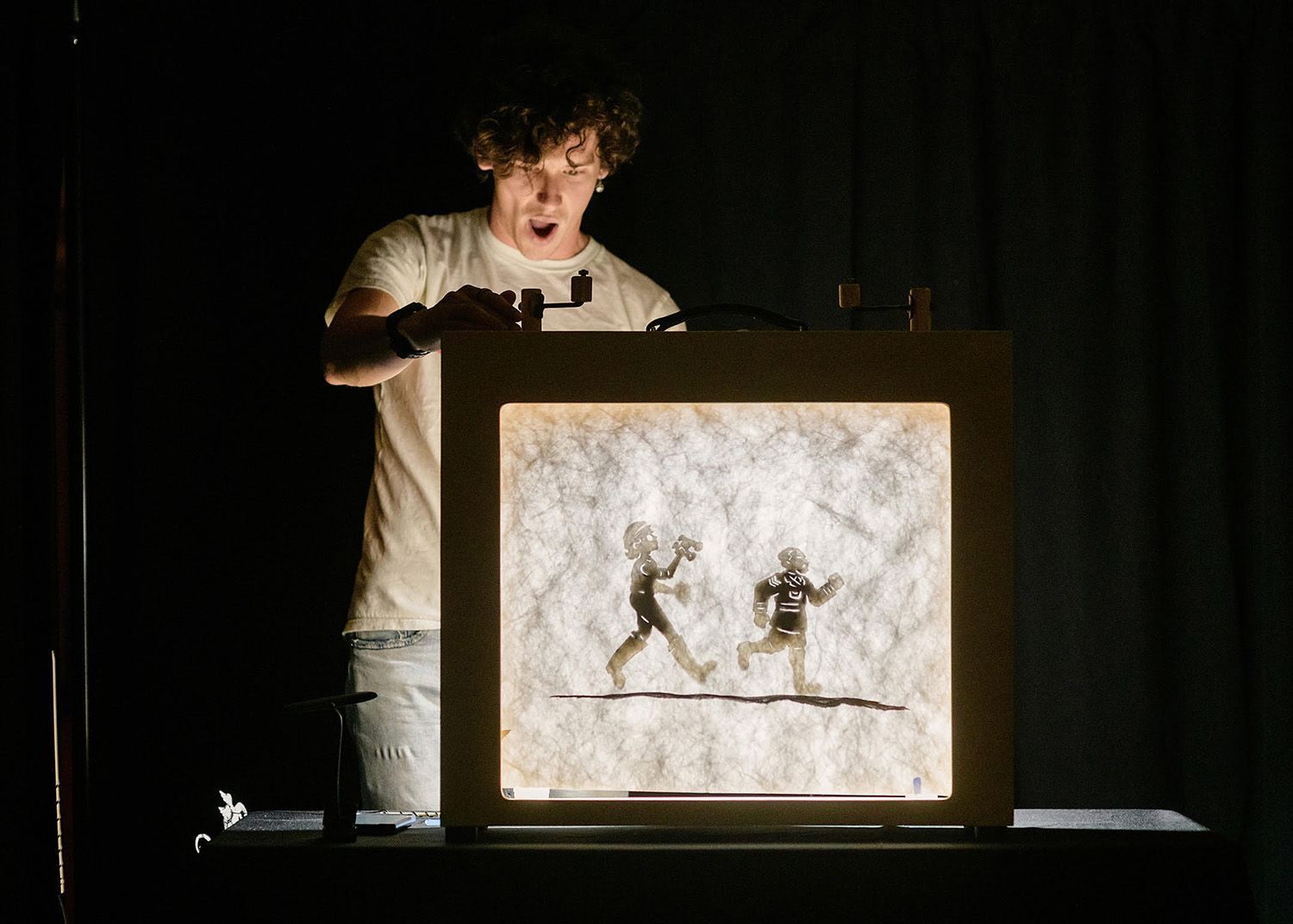 This is Eric’s 3rd year participating in the Crankie Fest. Eric is known for his boisterous performance rich storytelling and effective use of shadow puppetry. This year he used acrylic paints and pencils on tyvek to illustrate, and a combination of cardboard, tyvek, and wire for the puppets. Eric has always loved traditional folk and fairy tales, especially those that deal with humanity's deep and complex relationship with the forest and the other living things that dwell within them, and these inspired his original tale. For much of human history, the fear of the unknown or the unfamiliar has pushed us to extreme measures - Eric hopes that his story helps some friends to recognize that by learning more about what is different or strange, we can come to a better understanding and find that there might not have been any need for fear in the first place.