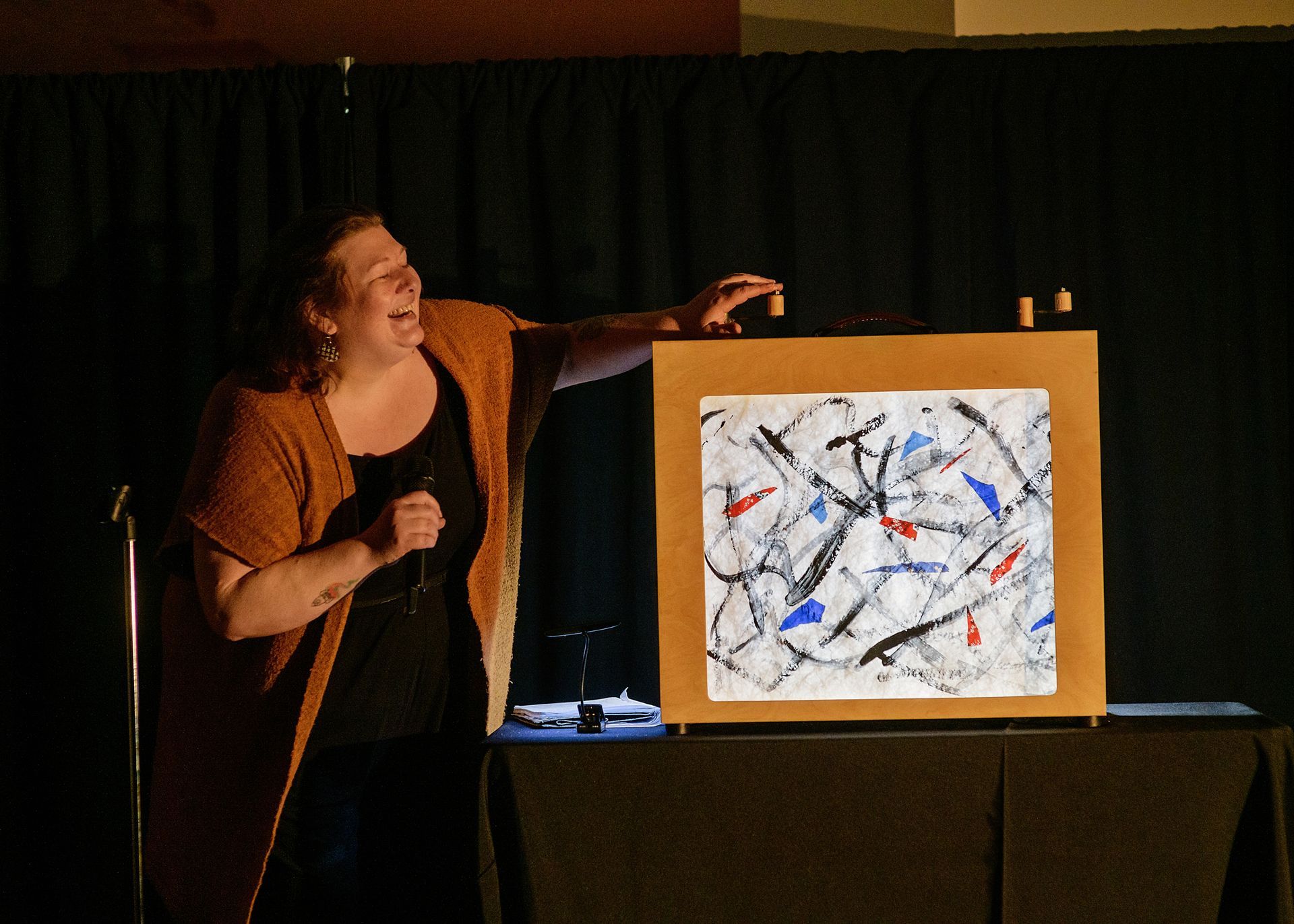 Inspired by the artist’s Japanese heritage, this crankie is an adaptation of a Japanese folktale, and reminds us that a tough exterior often hides a tender soul. It incorporates origami paper and ink.