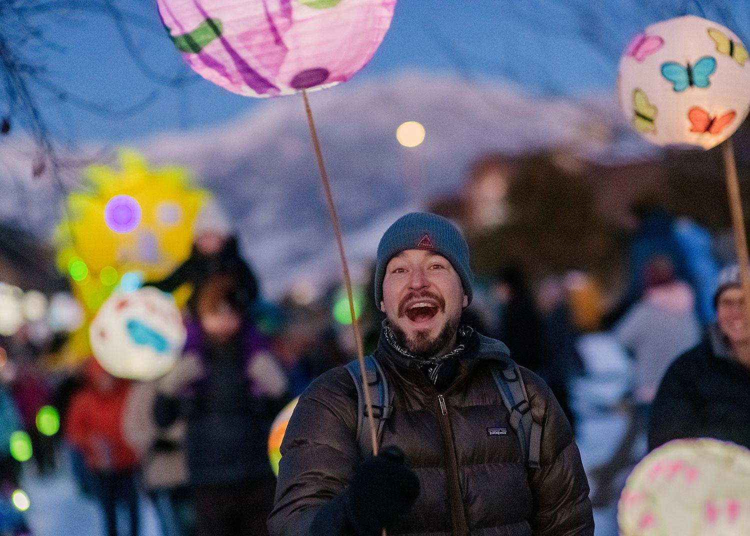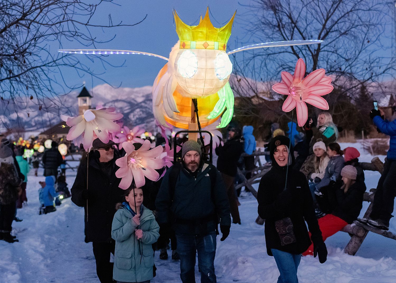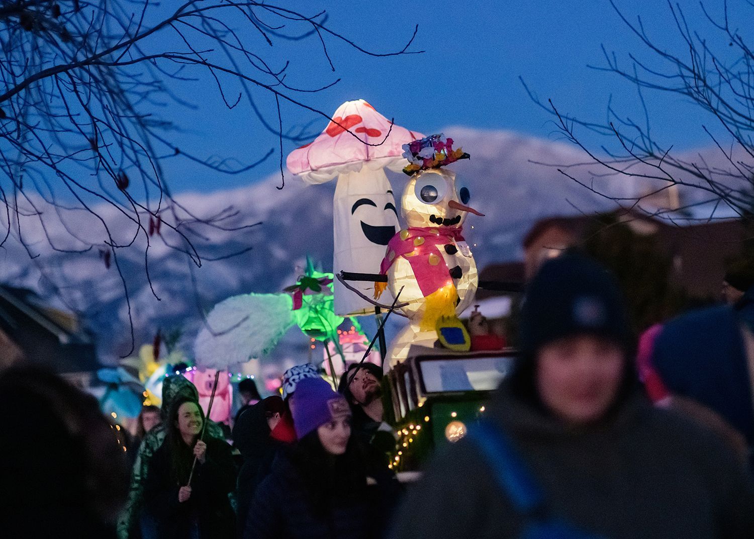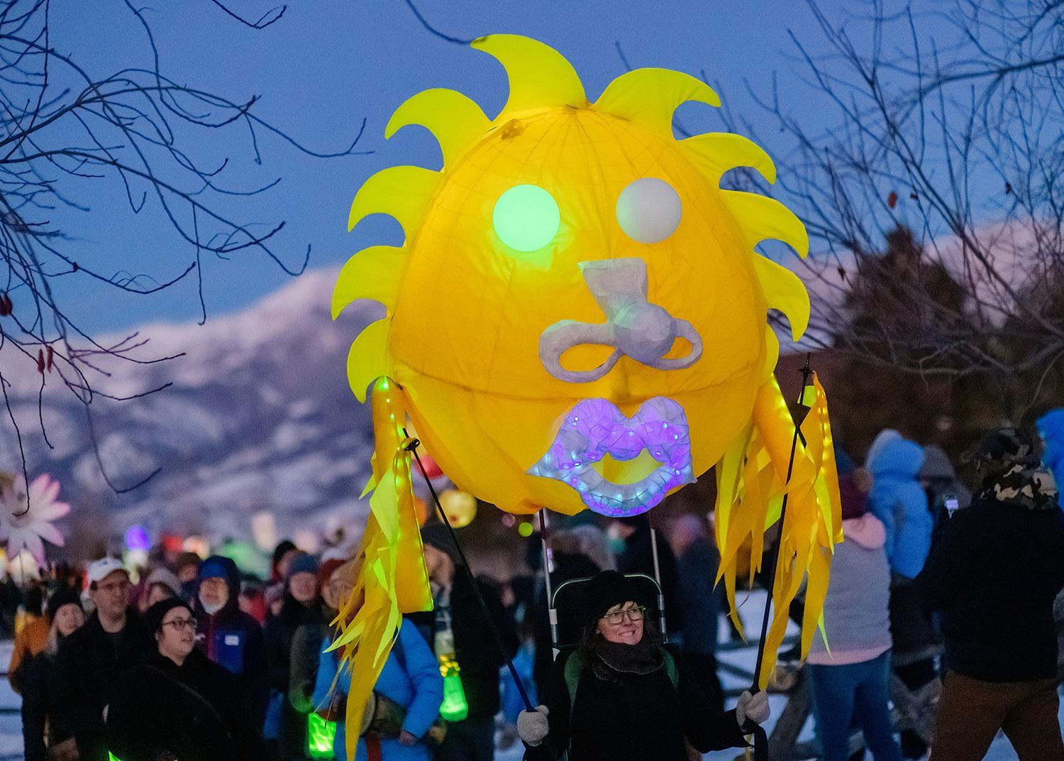 About the lanterns: The 2024 parade included more than 300 lanterns from many different places: community workshops and many creative families and individuals.In addition to the community created lanterns, the paraded feature special large scale lanterns created by local artists Thomas Dunning, Matt Cameron, Angela Yonke, Grace Washko, and Montana State University Art students. These artists received creative and technical support by professional lantern artist Gabs.