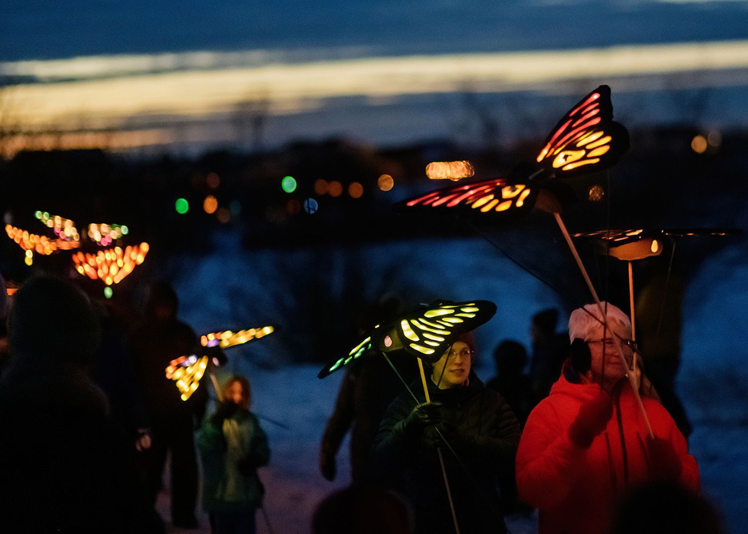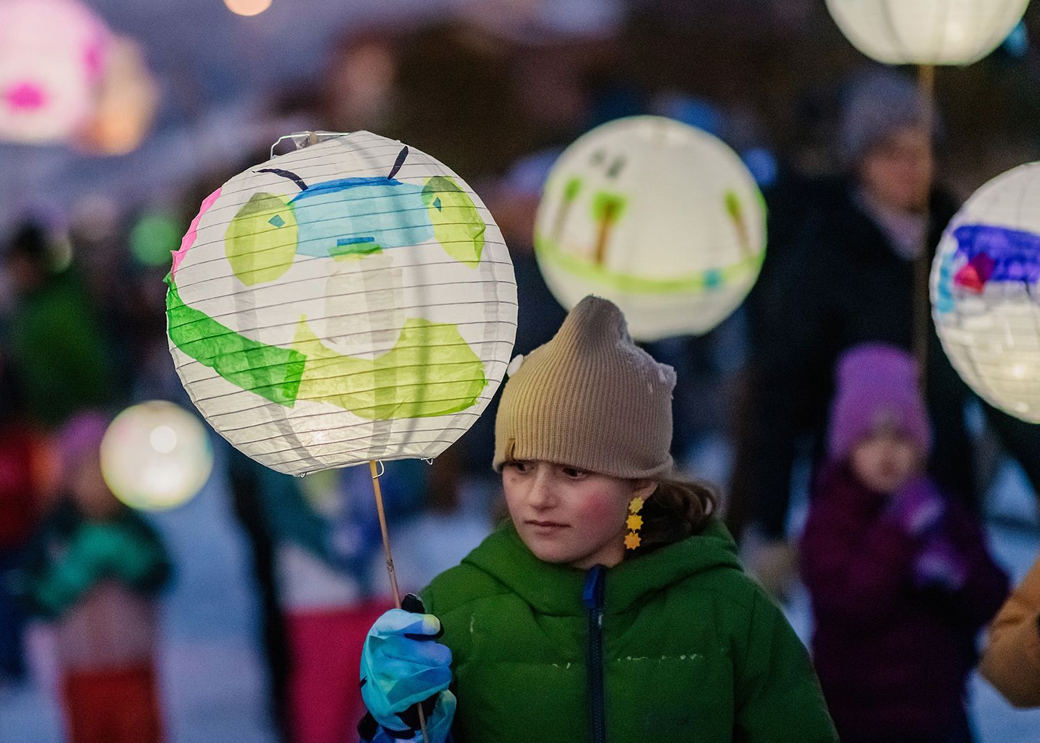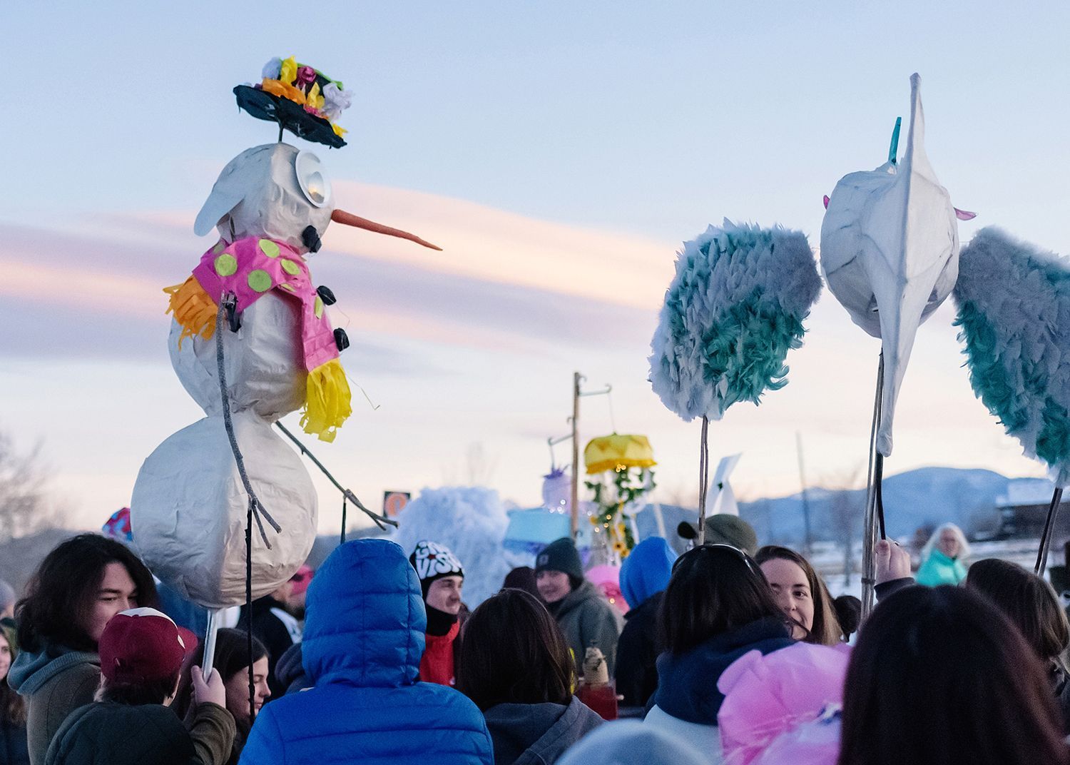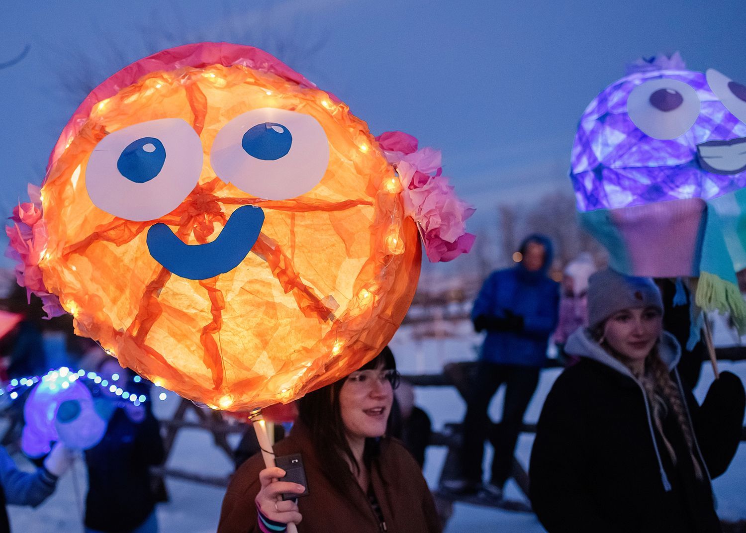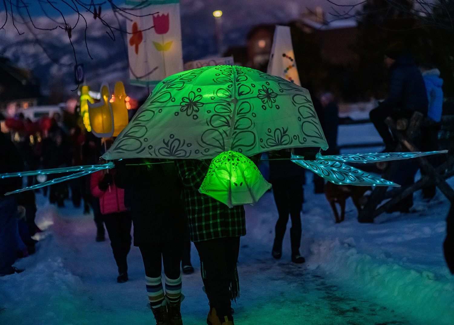 About the lanterns: The 2024 parade included more than 300 lanterns from many different places: community workshops and many creative families and individuals.In addition to the community created lanterns, the paraded feature special large scale lanterns created by local artists Thomas Dunning, Matt Cameron, Angela Yonke, Grace Washko, and Montana State University Art students. These artists received creative and technical support by professional lantern artist Gabs.